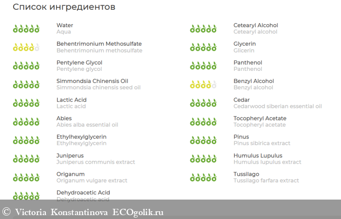 Aqua (вода дистиллированная), Cetearyl alcohol (цетилстеариловый спирт), Behentrimonium methosulfate* (эмульгатор BTMS), Glicerin (глицерин), Pentylene glycol** (пентилен гликоль), Panthenol (Д-пантенол), Hippophae rhamnoides оil (масло облепихи), Simmondsia chinensis (jojoba) seed oil (масло жожоба), Triticum vulgare(wheat) germ оil (масло зародышей пшеницы), Benzyl alcohol (бензиловый спирт), Lactic acid (молочная кислота), Cedarwood siberian essential oil (эфирное масло кедра), Juniperus communis essential oil (эфирное масло можжевельника), Abies alba essential oil (эфирное масло пихты), Tocopheryl acetate (витамин Е), Еthylhexylglycerin (этилгексилглицерин), Pinus sibirica extract (экстракт кедра), Juniperus communis extract (экстракт можжевельника), Humulus lupulus extract (экстракт хмеля), Origanum vulgare extract (экстракт душицы), Tussilago farfara extract (экстракт мать-и-мачехи), Dehydroacetic acid (дегидроуксусная кислота).