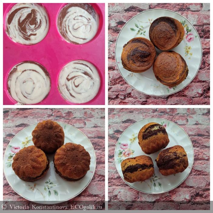 Поочередно выливать по столовой ложке каждую часть (светлую и темную) в форму для выпечки кексов. Выпекать 25 минут.