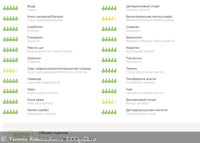 Aqua (вода дистиллированная), Cetearyl alcohol (цетилстеариловый спирт), Coco-caprylate/caprate (коко-каприлат/капрат), Behentrimonium Methosulfate* (бегентримониум метосульфат), Sorbitol (сорбитол), Squalane (сквалан), Glycerin (глицерин), Brassica oleracea italica seed oil (масло брокколи), Butyrospermum parkii (Shea) butter (масло ши), Hydrolyzed keratin (гидролизованный кератин), Creatine (креатин), Panthenol (Д-пантенол), Guar hydroxypropyltrimonium chloride (гуар гидроксипропилтримония хлорид), Citrus limon essential oil (эфирное масло лимона), Lavender essential oil (эфирное масло лаванды), Tocopheryl acetate (витамин Е), Avena sativa extract (экстракт овса), Camellia sinensis extract (экстракт зеленого чая), Aloe vera extract (экстракт алоэ вера), Benzyl alcohol (бензиловый спирт), Potassium sorbate (сорбат калия), Dehydroacetic acid (дегидроуксусная кислота).