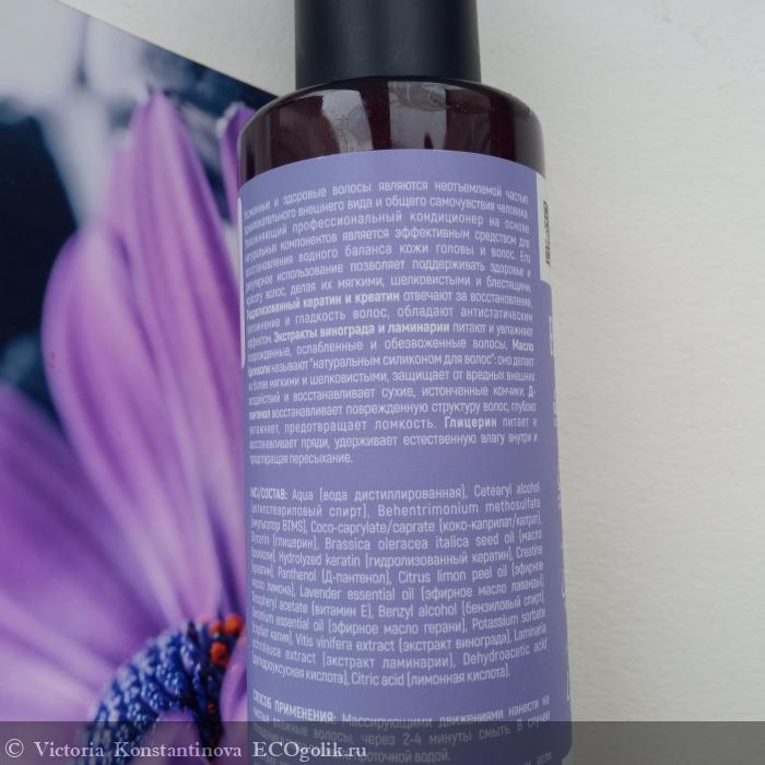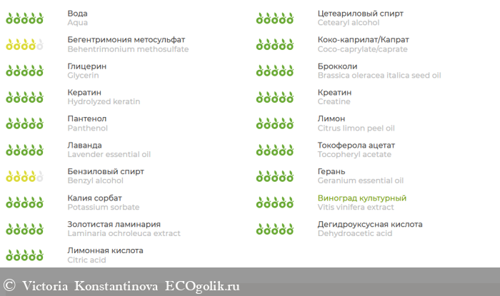 Aqua (вода дистиллированная), Cetearyl alcohol (цетилстеариловый спирт), Behentrimonium methosulfate* (эмульгатор BTMS), Coco-caprylate/caprate (коко-каприлат/капрат), Glycerin (глицерин растительный), Brassica oleracea italica seed oil (масло брокколи), Hydrolyzed keratin (гидролизованный кератин), Creatine (креатин), Panthenol (Д-пантенол), Citrus limon peel oil (эфирное масло лимона), Lavender essential oil (эфирное масло лаванды), Tocopheryl acetate (витамин Е), Benzyl alcohol (бензиловый спирт), Geranium essential oil (эфирное масло герани), Potassium sorbate (сорбат калия), Vitis vinifera extract (экстракт винограда), Laminaria ochroleuca extract (экстракт ламинарии), Dehydroacetic acid (дегидроуксусная кислота), Citric acid (лимонная кислота). * катионный эмульгатор растительного происхождения.