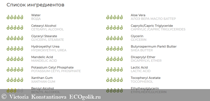 - ВОДА, ЦЕТЕАРИЛОВЫЙ СПИРТ, КАПРИЛИК/КАПРИК ТРИГЛИЦЕРИД, ГЛИЦЕРИЛ СТЕАРАТ, ГЛИЦЕРИН, ГИДРОКСИЭТИЛМОЧЕВИНА, ШИ (КАРИТЕ) МАСЛО, АЛОЭ ВЕРА МАСЛО БАТТЕР, МИНДАЛЬНАЯ КИСЛОТА, ДИКАПРИЛИЛОВЫЙ ЭФИР, КАЛИЯ ЦЕТИЛФОСФАТ, МОЛОЧНАЯ КИСЛОТА, КСАНТАНОВАЯ КАМЕДЬ, ТОКОФЕРОЛА АЦЕТАТ (ВИТАМИН E), БЕНЗИЛОВЫЙ СПИРТ, ЭТИЛГЕКСИЛГЛИЦЕРИН .