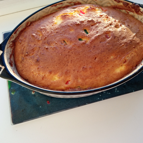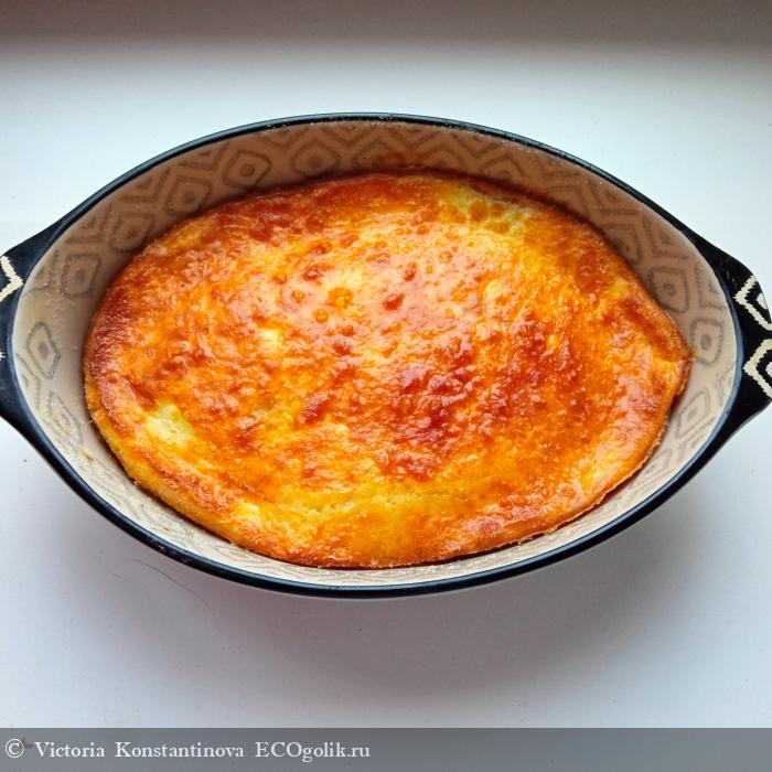 Взбиваем яйца с сахаром и разрыхлителем, добавляем остальные ингредиенты, перемешиваем, выкладываем в форму для выпекания. Я выпекаю ее 40 минут (20 минут верх, 10 минут низ, 10 минут средняя температура). После, того, как запеканка простоит в духовке 30 минут, нужно смешать желток + 1 столовая ложка молока или сливок + 1/3 чайной ложки куркумы. Вылить на запеканку. Получится вот такая красивая корочка. Обязательно использовать только желток