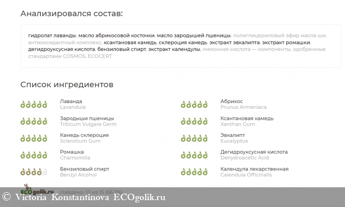 - гидролат лаванды, масло абрикосовой косточки, масло зародышей пшеницы, полиглицериловый эфир масла ши*, антиоксидантный комплекс*, ксантановая камедь, склероция камедь, экстракт эвкалипта, экстракт ромашки, дегидроуксусная кислота, бензиловый спирт, экстракт календулы, лимонная кислота. *— компоненты, одобренные стандартами COSMOS, ECOCERT.