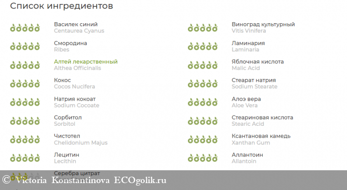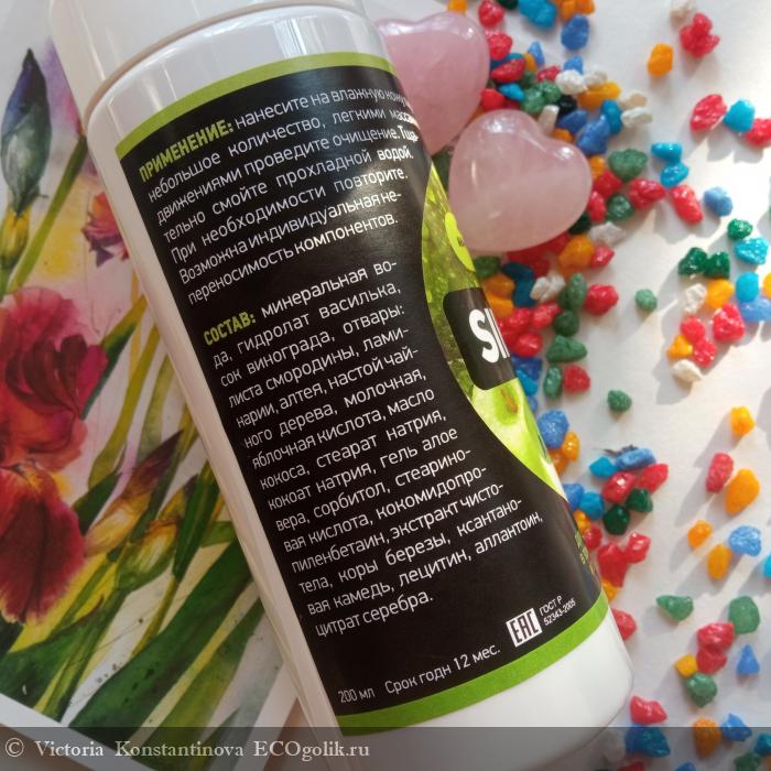 минеральная вода, гидролат василька, сок винограда, отвары: листа смородины, ламинарии, алтея, настой чайного дерева, молочная, яблочная кислота, масло кокоса, стеарат натрия, кокоат натрия, гель алое вера, сорбитол, стеариновая кислота, кокомидопропиленбетаин, экстракт чистотела, коры березы, ксантановая камедь, лецитин, аллантоин, цитрат серебра.