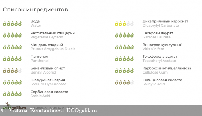 - Вода, дикаприловый карбонат, Растительный глицерин, Сахарозы лаурат, Масло сладкого миндаля, Масло винограда, Пантенол, Токоферол (витамин Е), Масло ши, Бензиловый спирт, Карбоксиметилцеллюлоза, Гиалуроновая кислота, Салициловая кислота, Сорбиновая кислота.