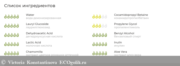 - вода деионизированная, кокамидопропилбетаин, лаурилглюкозид, кокоамфодиацетат, пропиленгликоль, дегидроуксусная кислота, бензиловый спирт, молочная кислота, инулин, экстракт цветков ромашки аптечной, экстракт череды трехраздельной, экстракт алоэ вера, парфюмерная композиция «Нежная кожа».