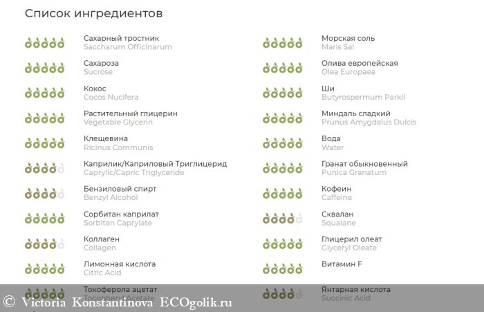 - сахар тростниковый, морская соль, сахароза, масло оливковое, масло кокосовое, масло карите, глицерин растительного происхождения, масло миндальных косточек, масло клещевины, вода деионизированная, триглицериды каприловой/каприновой кислот, алкилглюкозиды натрия, порошок граната, бензиловый спирт, кофеин, сорбитан каприлат, сквалан, гидролизованный коллаген, глицерил олеат, лимонная кислота, ароматизатор №9784, идентичный натуральному, комплекс полиненасыщенных жирных кислот (витамин F), токоферола ацетат (витамин Е), янтарная кислота.