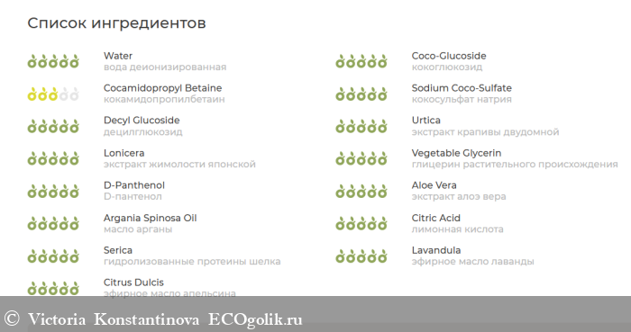 - вода деионизированная, кокоглюкозид, кокамидопропилбетаин,кокосульфат натрия, децилглюкозид, экстракт крапивы двудомной, экстракт жимолости японской, глицерин растительного происхождения, D-пантенол, экстракт алоэ вера, масло арганы, лимонная кислота, гидролизованные протеины шелка.