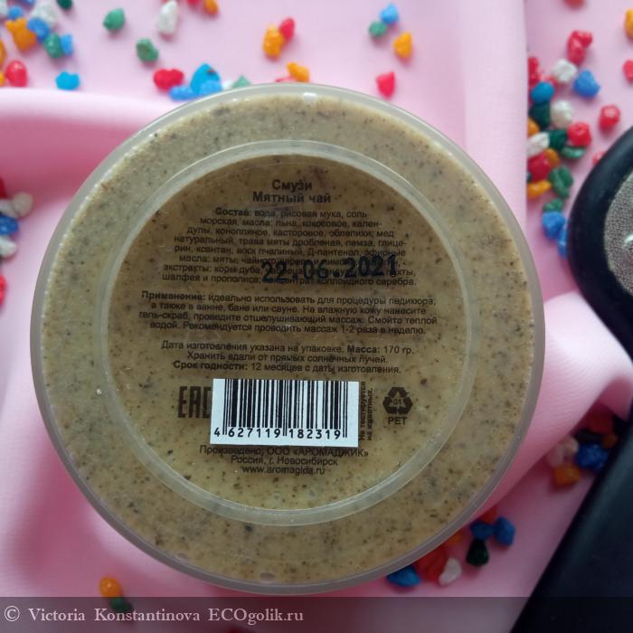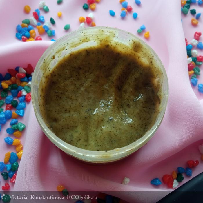 Скраб реально похож на смузи и, если не знать состав, то словно это коктейль из киви, мяты и крапивы, согласны? Он болотного цвета, с многочисленными вкраплениями. Аромат скраба мне очень понравился! Он натуральный, при этом довольно сбалансированный и приятный! Так сказать: освежающий! Ведь мы же хотим, чтобы во время использования наши стопы освежились, взбодрились, отлично проскрабировались и размягчились.