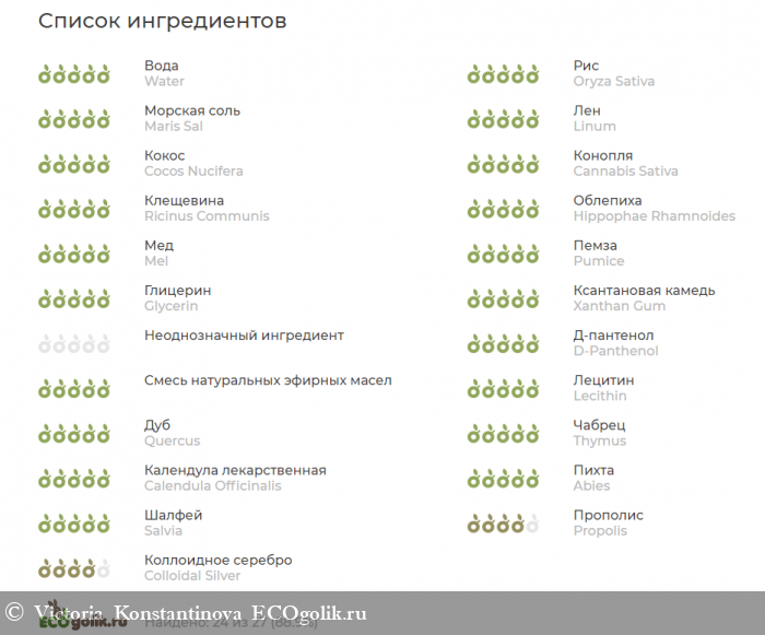 вода, рисовая мука, соль морская, масла: льна, кокосовое, календулы, конопляное, касторовое, облепихи; мед натуральный, трава мяты дробленная, пемза, глицерин, ксантан, воск, д-пантенол, эфирные масла (мяты, чайного дерева, лимона), лецитин, экстракты: коры дуба, чабреца, календулы, хвои пихты, шалфея и прополиса; концентрат коллоидного серебра.