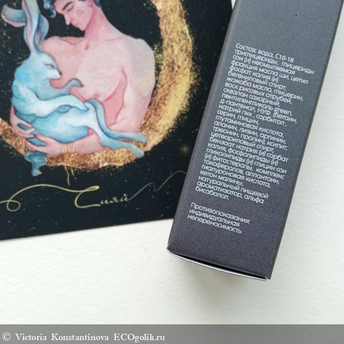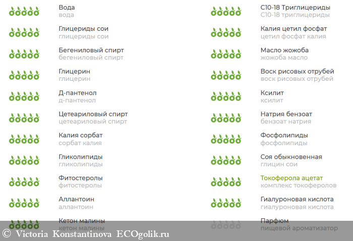 - вода, С10-18 триглицериды, глицериды сои (и) неомыляемая фракция масла ши, цетил фосфат калия (и) бегениловый спирт, жожоба масло, глицерин, воск рисовых отрубей, сквалан сахарный, пентиленгликоль green, д-пантенол, НУФ (бетаин, натрий PCA, лактат натрия, пирролидонкарбоновая кислота, серин, аланин, глицин, глутаминовая кислота, лизина гидрохлорид, треонин, аргинин, пролин), ксилит, цетеариловый спирт, бензоат натрия (и) сорбат калия, фосфолипиды (и) гликолипиды (и) глицин сои (и) фитостеролы, комплекс токоферолов, аллантоин, гиалуроновая кислота, кетон малины, пищевой ароматизатор, альфа бисаболол.
