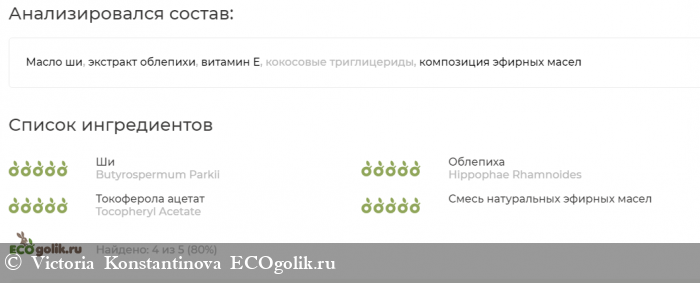 - Масло ши, экстракт облепихи, витамин Е, кокосовые триглицериды, композиция эфирных масел.