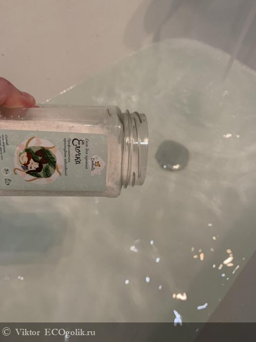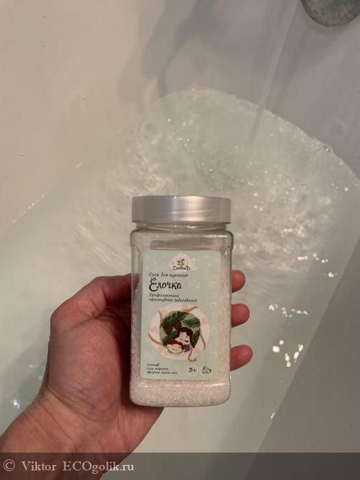 Из банки пахнет достаточно сильно, будто не натурально. А в воде уже нет, буквально первые несколько минут. Причем у меня вопрос - а елка ли это. Кроме того, эта соль не щиплет через ранки. Или соли мало на объем воды, или соль такая. Я бывало соль ложил, так ее чувствуешь