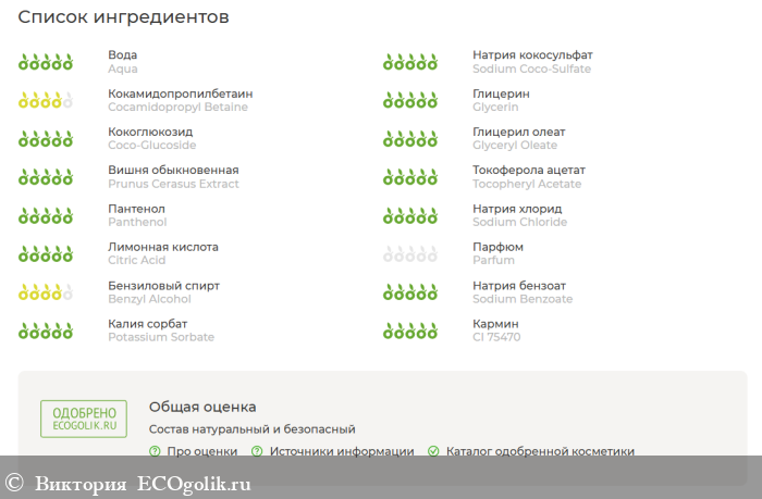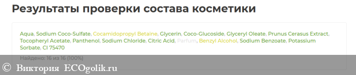 Состав INCI: Aqua (Вода), Sodium Coco-Sulfate (Натрия кокосульфат / ПАВ из кокосового масла, сертификат ECOCERT, разрешён по стандарту COSMOS для производства органической косметики), Cocamidopropyl Betaine (Кокамидопропилбетаин), Glycerin (Глицерин), Coco-Glucoside (Кокоглюкозид), Glyceryl Oleate (Глицерил олеат), Prunus Cerasus Extract (Экстракт вишни), Tocopheryl Acetate (Витамин Е), Panthenol (Пантенол), Sodium Chloride (Натрия хлорид), Citric Acid (Лимонная кислота), Parfum (Отдушка), Benzyl Alcohol, Sodium Benzoate, Potassium Sorbate (Бензиловый спирт, натрия бензоат, калия сорбат / консервант, разрешённый по стандарту COSMOS для производства органической косметики), CI 75470 (Натуральный краситель кармин).