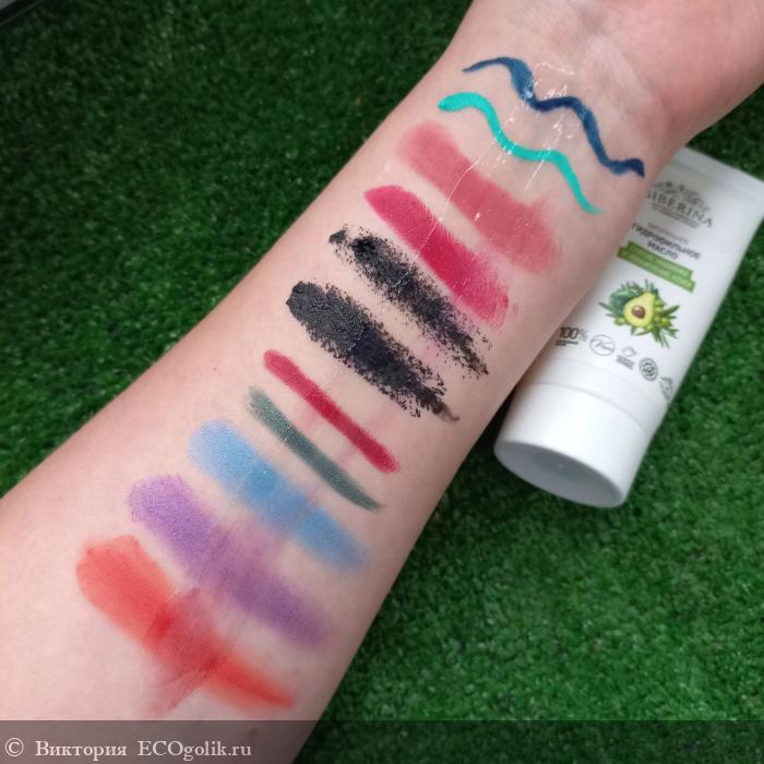 В качестве небольшого теста я нанесла на предплечье свотчи разной стойкой косметики. Здесь два вида туши: одна водостойкая, другая влагостойкая, матовые помады, карандаши для губ и глаз, подводки и тени.