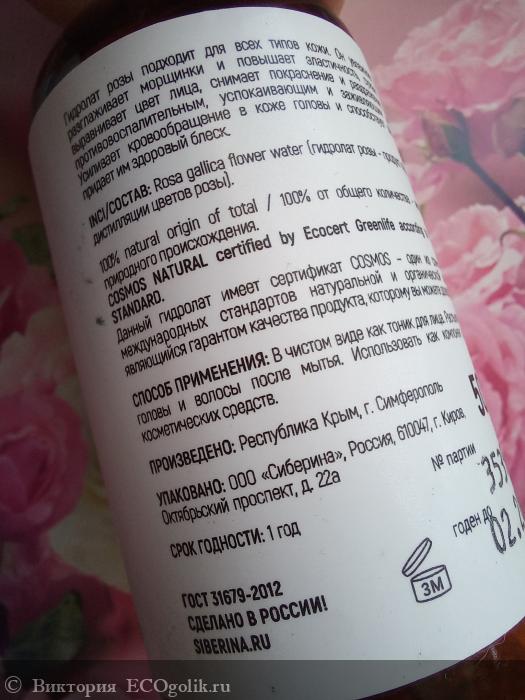 Я рекомендую попробовать именно этот гидролат от бренда Siberina, так как он на 100% натуральный и не содержит постороних примесей и консервантов.