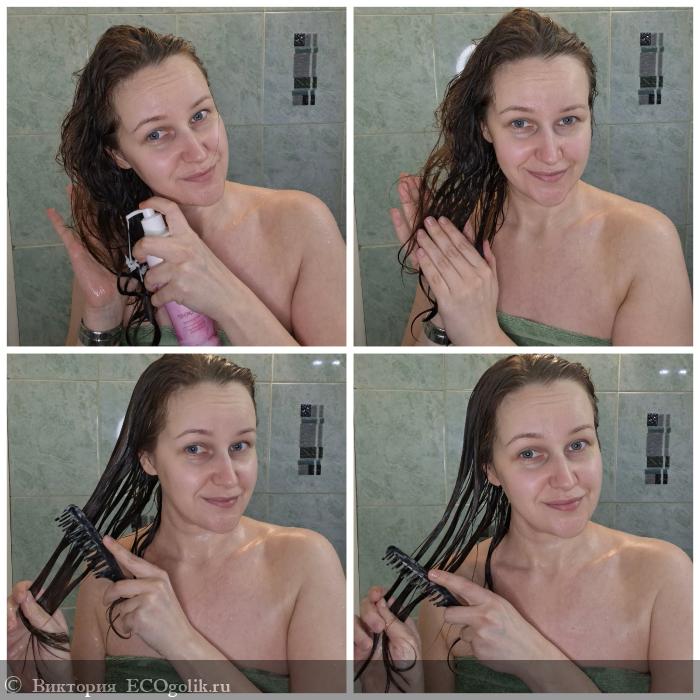 После мытья волос, я немного отжимаю волосы и наношу кондиционер на длину волос, отступая от корней несколько сантиметров.