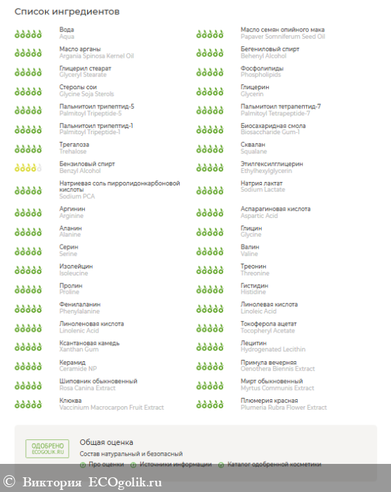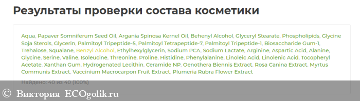 Aqua, Papaver Somniferum Seed (мака семян) Oil, Argania Spinosa Kernel (арганы) Oil, Behenyl Alcohol (and) Glyceryl Stearate (and) Phospholipids (and) Glycine Soja Sterols, Glycerin (and) Palmitoyl Tripeptide-5 (and) Palmitoyl Tetrapeptide-7 (and) Palmitoyl Tripeptide-1, Biosaccharide Gum-1, Trehalose, Squalane, Benzyl Alcohol (and) Ethylhexylglycerin, Sodium PCA (and) Sodium Lactate (and) Arginine (and) Aspartic Acid (and) Alanine (and) Glycine (and) Serine (and) Valine (and) Isoleucine (and) Threonine (and) Proline (and) Histidine (and) Phenylalanine, Linoleic Acid (and) Linolenic Acid, Tocopheryl Acetate, Xanthan Gum, Hydrogenated Lecithin, Ceramide NP, Oenothera Biennis (примулы вечерней) Extract, Rosa Canina (шиповника) Extract, Myrtus Communis (мирта) Extract, Vaccinium Macrocarpon Fruit (клюквы) Extract, Plumeria Rubra (Frangipani) Flower (франжипани) Extract.