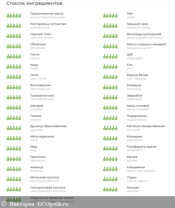 омыленные масла подсолнечника, льна, расторопши, кедрового ореха, грецкого ореха, черного тмина, виноградной косточки, облепихи, миндальное, пихтовое ; экстракты деревьев:кора березы, кора дуба, березовые почки, хвоя кедра, побеги ели, цвет липы, хвоя пихты, лист березы; травы:бессмертник, ромашка, пустырник, тысячелистник, зверобой, шалфей, хвощ полевой, пижма, подорожник, душица, мелисса, мята, розмарин; воск косметический, мед, витамин "Е", прополис, мумие, дигидрокверцитин, живица, масло касторовое, молочная кислота, смола ладана, гиалуроновая кислота, хитозан, композиция эфирных масел.