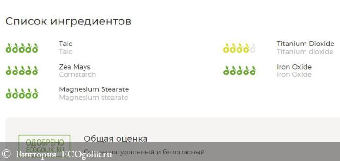 Talc (тальк), Titanium dioxide (диоксид титана), Cornstarch (кукурузный крахмал), Iron Oxide (оксид железа), Magnesium stearate (стеарат магния).