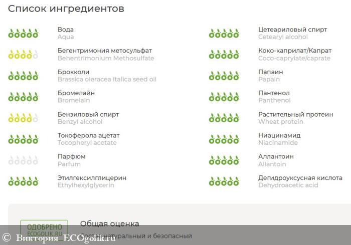 Aqua (вода дистиллированная), Cetearyl alcohol (цетилстеариловый спирт), Behentrimonium Methosulfate (бегентримониум метосульфат), Coco-caprylate/caprate (коко-каприлат/капрат), Brassica oleracea italica seed oil (масло брокколи), Papain (папаин), Bromelain (бромелайн), Panthenol (Д-пантенол), Benzyl alcohol (бензиловый спирт), Wheat protein (пшеничный протеин), Tocopheryl acetate (витамин Е), Niacinamide (ниацинамид), Parfum (отдушка), Allantoin (аллантоин), Ethylhexylglycerin (этилгексилглицерин), Dehydroacetic acid (дегидроуксусная кислота).