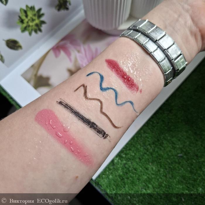 Здесь у меня стойкая матовая помада, синяя водостойкая подводка для глаз, коричневый каял для слизистой, термостойкая тушь и пигментированные румяна. Вся косметика очень стойкая и обычно я смываю её гидрофильным маслом или двухфазной мицеллярной водой с маслами.