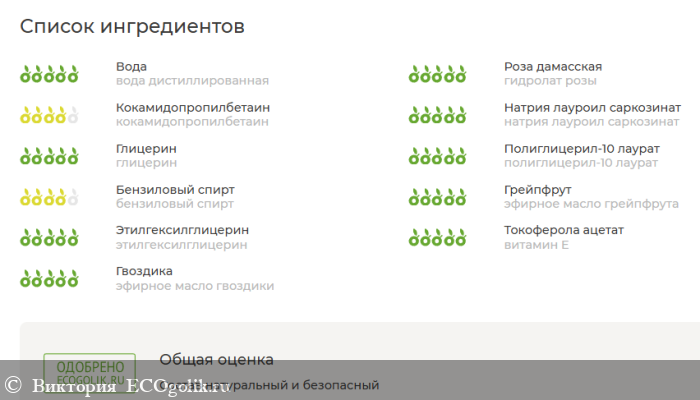 вода дистиллированная (Aqua), гидролат розы (Rosa gallica L. water), кокамидопропилбетаин (Cocamidopropyl betaine), натрия лауроил саркозинат (Sodium lauroyl sarcosinate), глицерин (Glycerin), полиглицерил-10 лаурат* (Polyglyceryl-10 laurate), бензиловый спирт (Benzyl alcohol), эфирное масло грейпфрута (Citrus paradisi essential oil), этилгексилглицерин (Еthylhexylglycerin), витамин Е (Tocopheryl acetate), эфирное масло гвоздики (Eugenia Caryophyllata essential oil).