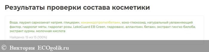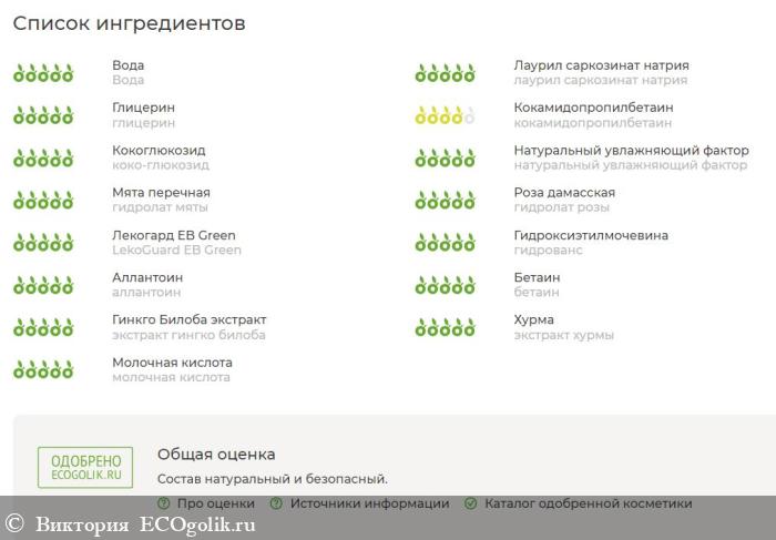 Вода, лаурил саркозинат натрия, глицерин, кокамидопропилбетаин, коко-глюкозид, натуральный увлажняющий фактор, гидролат мяты, гидролат розы, LekoGuard EB Green, гидрованс, аллантоин, бетаин, экстракт гинго-билоба, экстракт хурмы, молочная кислота.