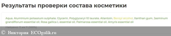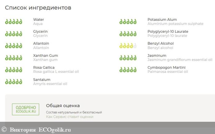 Aqua (вода дистиллированная), Aluminium potassium sulphate (квасцы алюмокалиевые), Glycerin (глицерин), Polyglyceryl-10 laurate* (полиглицерил-10 лаурат), Allantoin (аллантоин), Benzyl alcohol (бензиловый спирт), Xanthan gum (ксантановая камедь), Jasminum grandiflorum essential oil (эфирное масло жасмина), Rosa gallica L. essential oil (эфирное масло розы), Palmarosa essential oil (эфирное масло пальмарозы), Amyris essential oil (эфирное масло сандала).