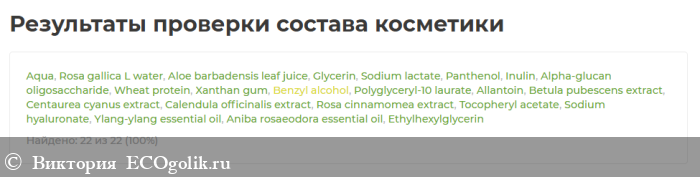 Aqua (вода дистиллированная), Rosa gallica L. water (гидролат розы), Aloe barbadensis leaf juice (гель алоэ вера), Glycerin (глицерин), Sodium lactate (лактат натрия), Panthenol (Д-пантенол), Inulin (инулин), Alpha-glucan oligosaccharide (альфа-глюкан олигосахарид), Wheat protein (пшеничный протеин), Xanthan gum (ксантановая камедь), Benzyl alcohol (бензиловый спирт), Polyglyceryl-10 laurate* (полиглицерил-10 лаурат), Allantoin (аллантоин), Betula pubescens extract (экстракт коры березы), Centaurea cyanus extract (экстракт василька), Calendula officinalis extract (экстракт календулы), Rosa cinnamomea extract (экстракт шиповника), Tocopheryl acetate (витамин Е), Sodium hyaluronate (гиалуронат натрия), Ylang-ylang essential oil (эфирное масло иланг-иланг), Aniba rosaeodora essential oil (эфирное масло розового дерева), Ethylhexylglycerin (этилгексилглицерин). *эмульгатор, полученный из жирных кислот кокосового и пальмового масла.