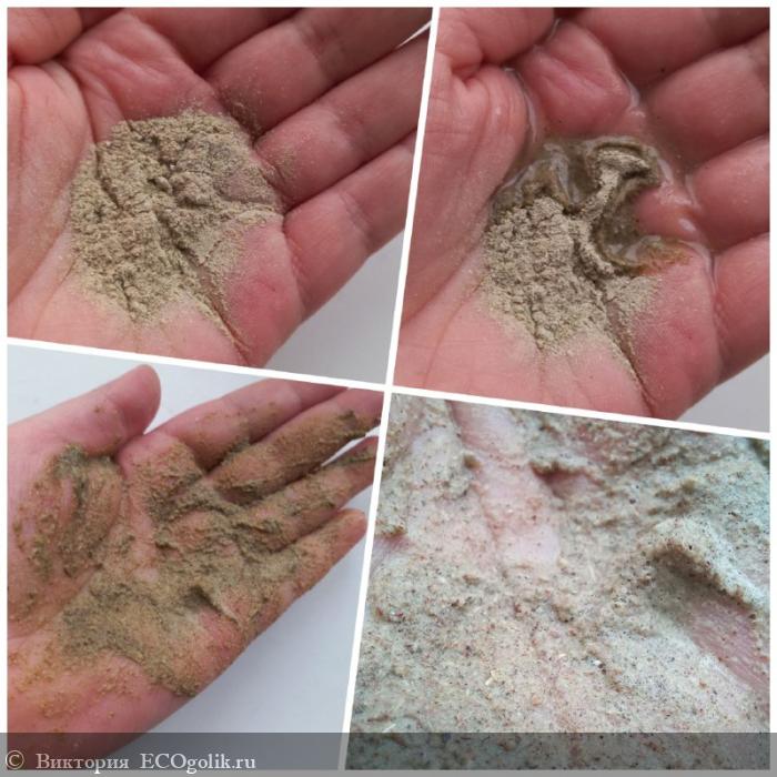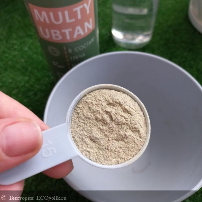 Я насыпаю в ладонь немного убтана - примерно чайную ложку, добавляю немного воды и смешиваю до однородного состояния. Получается подобие мягкого скраба.
