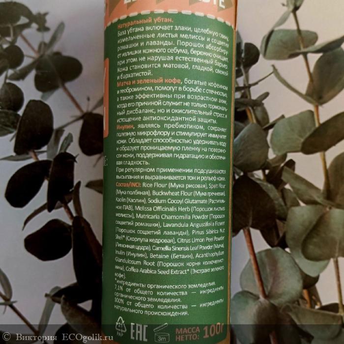 Rice Flour (Мука рисовая), Spelt Flour (Мука полбяная), Buckwheat Flour (Мука гречневая), Kaolin (Каолин), Sodium Cocoyl Glutamate (Растительное ПАВ), Melissa Officinalis Herb (Порошок листьев мелиссы), Matricaria Chamomilla Powder (Порошок соцветий ромашки), Lavandula Angustifolia Flower (Порошок соцветий лаванды), Pinus Sibirica Nut Shell* (Скорлупа кедровая), Citrus Limon Peel Powder (Лимонная цедра), Camellia Sinensis Leaf Powder (Матча), Inulin (Инулин), Betaine (Бетаин), Acanthophyllum Glandulosum Root (Порошок корня колючелистника), Coffea Arabica Seed Extract* (Экстракт зеленого кофе).