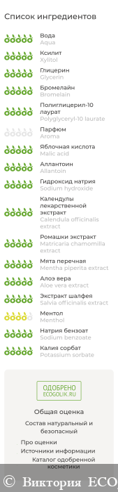 Aqua (вода дистиллированная), Xylitol (ксилит), Glycerin (глицерин), Bromelain (бромелайн), Polyglyceryl-10 laurate* (полиглицерил-10 лаурат), Aroma (ароматизатор), Malic acid (яблочная кислота), Allantoin (аллантоин), Sodium hydroxide (гидроксид натрия), Calendula officinalis extract (экстракт календулы), Matricaria chamomilla extract (экстракт ромашки), Mentha piperita extract (экстракт мяты), Aloe vera extract (экстракт алоэ вера), Salvia officinalis extract (экстракт шалфея), Menthol (ментол), Sodium benzoate (бензоат натрия), Potassium sorbate (сорбат калия)