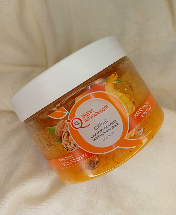 Приветствую Вас Дорогие Экоблогеры🧡 Хочу рассказать о новом для меня средстве, и поделиться впечатлениями: Скраб для тела сахарно-солевой отшелушивающий масло Манго и Марулы🧡Индекс натуральности🧡Основная информация от производителя🧡Сахарно-солевой скраб для тела содержит природные абразивы, которые деликатно отшелушивают с поверхности кожи отслоившиеся клетки эпителия,...