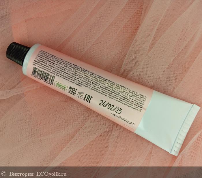 Дизайн тюбика выполнен в минималистичном стиле, который подчеркивает элегантность и современность продукта. Тюбик металлический, белого цвета. На тюбике наклеена наклейка. Нежный пастельный оттенок розовой наклейки создает ощущение мягкости и заботы, а лаконичная надпись SHABBY PRO добавляет изысканности, также напечатано название продукта, некоторый состав и его предназначение.