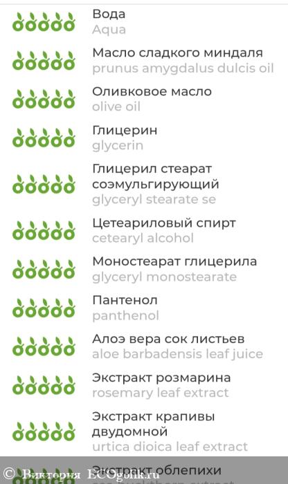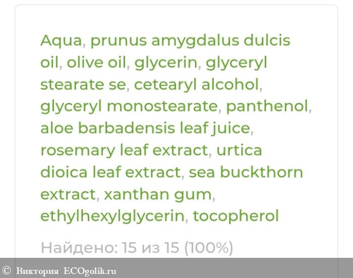 Aqua, prunus amygdalus dulcis oil, olive oil, glycerin, glyceryl stearate se, cetearyl alcohol, glyceryl monostearate, hydrogenated soybean oil, panthenol, aloe barbadensis leaf juice, rosemary leaf extract, urtica dioica leaf extract, sea buckthorn extract, xanthan gum, benzyl alcohol, ethylhexylglycerin, tocopherol.