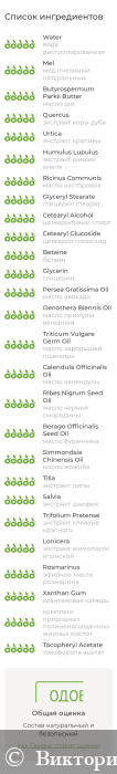 Вода дистиллированная, мед пчелиный натуральный, масло ши, экстракт коры дуба, экстракт крапивы, экстракт шишек хмеля, масло касторовое, глицерил стеарат, цетеариловый спирт, цетеарил глюкозид, бетаин, глицерин, масло авокадо, масло примулы вечерней, масло зародышей пшеницы, масло календулы, масло черной смородины, масло бурачника, масло жожоба, экстракт липы, экстракт шалфея, экстракт клевера красного, экстракт жимолости японской, эфирное масло розмарина, ксантановая камедь, комплекс природных полиненасыщенных жирных кислот (витамин F), токоферола ацетат (витамин Е)