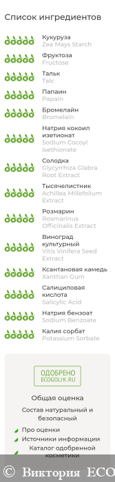 Zea Mays Starch, Fructose, Talc, Papain, Bromelain, Sodium Cocoyl Isethionate, Glycyrrhiza Glabra Root Extract, Achillea Millefolium Extract, Rosmarinus Officinalis (Rosemary) Extract, Vitis Vinifera Seed Extract, Xanthan Gum, Salicylic Acid, Sodium Benzoate, Potassium Sorbate