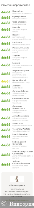 Гидролат розмарина, мягкая «зеленая» моющая основа, глицерил олеат, кокоглюкозид, экстракт корня пиона, натуральный свекольный бетаин, молочная кислота, молочнокислый калий, экстракт корня имбиря, экстракт жимолости японской, глицерин растительного происхождения, бензиловый спирт, аллантоин, эфирное масло иланг-иланг, эфирное масло базилика, эфирное масло кипариса, эфирное масло розового дерева, сорбиновая кислота, токоферола ацетат (витамин Е), ксантановая камедь.