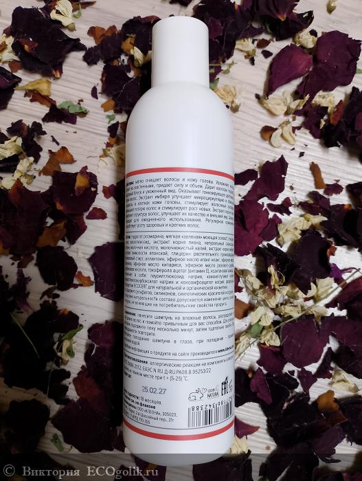 Действие: мягко очищает волосы и кожу головы. Увлажняет волосы, делает их эластичными, придает силу и объем. Дарит волосам гладкость, здоровый блеск и ухоженный вид. Оказывает тонизирующее действие на корни волос. Экстракт имбиря улучшает микроциркуляцию и обменные процессы в клетках кожи головы, стимулирует волосяные луковицы, уменьшает потерю волос и стимулирует рост новых. Экстракт корня пиона укрепляет структуру волос, улучшает их качество и внешний вид. Шампунь подходит для ежедневного использования. Регулярное применение способствует росту здоровых и крепких волос.