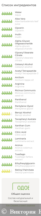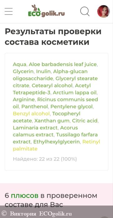 Aqua (вода дистиллированная), Aloe barbadensis leaf juice (гель алоэ вера), Glycerin (глицерин растительный), Inulin (инулин), Alpha-glucan oligosaccharide (альфа-глюкан олигосахарид), Glyceryl stearate citrate (глицерил стеарат цитрат), Cetearyl alcohol (цетилстеариловый спирт), Acetyl Tetrapeptide-3 (ацетил тетрапептид-3), Arctium lappa (burdock) oil (масло репейное), Arginine (аргинин), Ricinus communis seed oil (масло касторовое), Panthenol (Д-пантенол), Pentylene glycol* (пентилен гликоль), Benzyl alcohol (бензиловый спирт), Tocopheryl acetate (витамин Е), Xanthan gum (ксантановая камедь), Citric acid (лимонная кислота), Laminaria extract (экстракт ламинарии), Acorus calamus extract (экстракт аира), Tussilago farfara extract (экстракт мать-и-мачехи), Ethylhexylglycerin (этилгексилглицерин), Retinyl palmitate (витамин А). *изготовлен из багассы, получаемой из сахарного тростника.