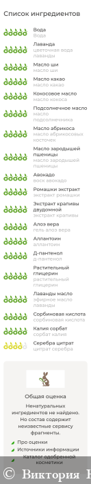 Вода, цветочная вода лаванды, масло ши, масло какао, масло кокоса, масло подсолнечника, масло абрикосовых косточек, масло зародышей пшеницы, глицерилмоностерат, воск авокадо, экстракт ромашки, экстракт крапивы, гель алоэ вера, аллантоин, д-пантенол (провитамин В5), растительный глицерин, эфирное масло лаванды, сорбиновая кислота, минеральный пигмент, сорбат калия, цитрат серебра, молочная кислота.