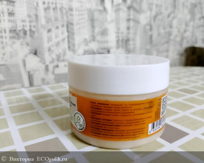 Крем находится в красивой цитрусовой баночке. На наклейке присутствует информация о производителе и товаре. Открывается и закрывается баночка с помощью крышки шайба.