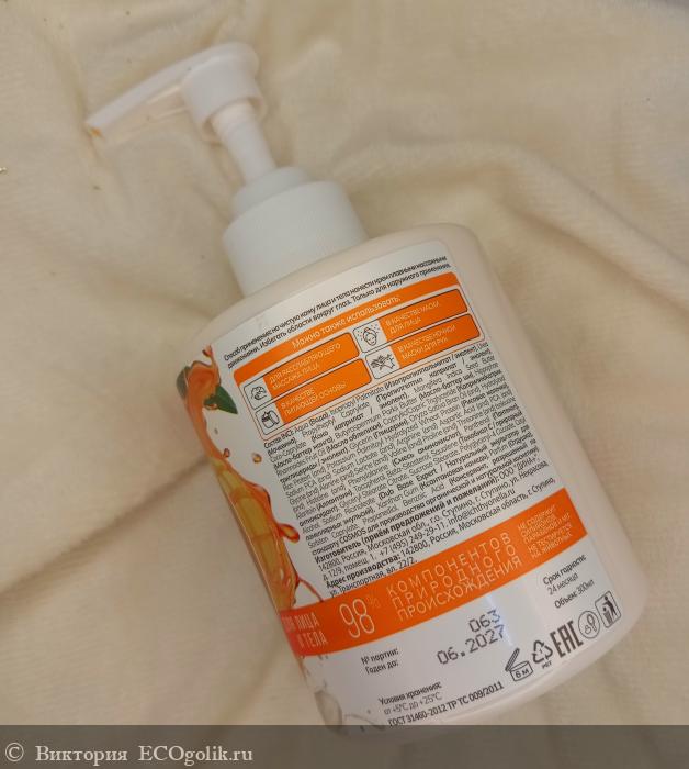Яркий, красочный, блестящий. Флакон выполнен из мягкого, прочного пластика белого цвета. Удобный, плотный дозатор выполнен из прочного, белого пластика. По кругу флакона наклеена круговая, белая наклейка.