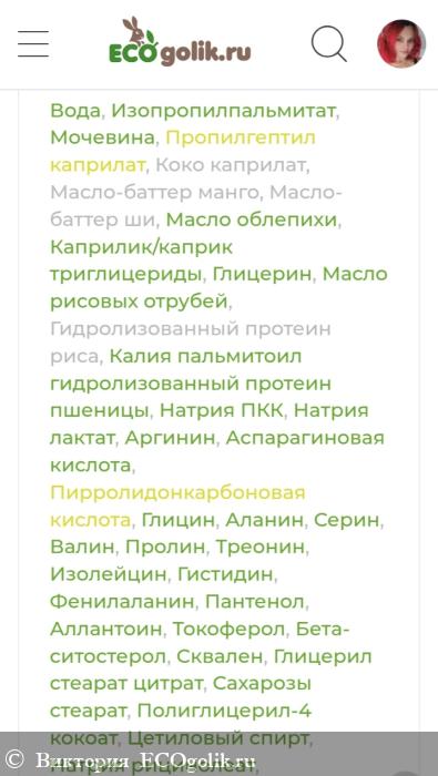 Вода, Изопропилпальмитат, Мочевина, Пропилгептил каприлат, Коко каприлат, Масло-баттер манго, Масло-баттер ши, Масло облепихи, Каприлик/каприк триглицериды, Глицерин, Масло рисовых отрубей (и) Гидролизованный протеин риса (и) Калия пальмитоил гидролизованный протеин пшеницы (Рисовое молочко), Натрия ПКК (и) Натрия лактат (и) Аргинин (и) Аспарагиновая кислота (и) Пирролидонкарбоновая кислота (и) Глицин (и) Аланин (и) Серин (и) Валин (и) Пролин (и) Треонин (и) Изолейцин (и) Гистидин (и) Фенилаланин (Смесь аминокислот), Пантенол, Аллантоин, Токоферол, Бета-ситостерол, Сквален, Глицерил стеарат цитрат, Сахарозы стеарат, Полиглицерил-4 кокоат, Цетиловый спирт, Натрия рицинолеат, Ксантановая камедь, Отдушка, Сорбитан каприлат, Пропандиол, Бензойная кислота.