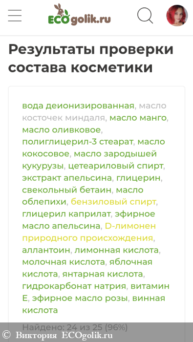 Вода деионизированная, масло косточек миндаля, масло манго, масло оливковое, полиглицерил-3 стеарат, масло кокосовое, масло зародышей кукурузы, цетеариловый спирт, экстракт апельсина, глицерин, свекольный бетаин, масло облепихи, бензиловый спирт, глицерил каприлат, эфирное масло апельсина, D-лимонен природного происхождения, аллантоин, лимонная кислота, молочная кислота, яблочная кислота, янтарная кислота, гидрокарбонат натрия, витамин Е, эфирное масло розы, винная кислота.