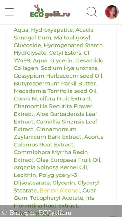 (INCI): Aqua, Hydroxyapatite (гидроксиапатит), Acacia Senegal Gum (камедь акации), Maltooligosyl Glucoside (and) Hydrogenated Starch Hydrolysate, Cetyl Esters (цетиловый эфир), CI 77499 (черный оксид железа), Aqua (and) Glycerin (and) Desamido Collagen (and) Sodium Hyaluronate (комплекс коллагена и гиалуроновой кислоты), Gossypium Herbaceum seed (хлопка) Oil (and) Butyrospermum Parkii (Ши) Butter (and) Macadamia Ternifolia seed (макадамии) Oil (and) Cocos Nucifera Fruit (кокоса) Extract (and) Chamomilla Recutita Flower (ромашки) Extract (and) Aloe Barbadensis Leaf (алоэ) Extract (and) Camellia Sinensis Leaf (зеленого чая) Extract (and) Cinnamomum Zeylanicum Bark (корицы) Extract (and) Acorus Calamus Root (аира) Extract (and) Commiphora Myrrha Resin (мирры) Extract (and) Olea Europaea Fruit (оливы) Oil (and) Argania Spinosa Kernel (арганы) Oil (and) Lecithin (and) Polyglyceryl-3 Diisostearate (and) Glycerin (and) Glyceryl Stearate, Benzyl Alcohol, Guar Gum (гуаровая камедь), Tocopheryl Acetate (витамин Е), Iris Florentina Root (ириса) Extract, Ethylhexylglycerin.