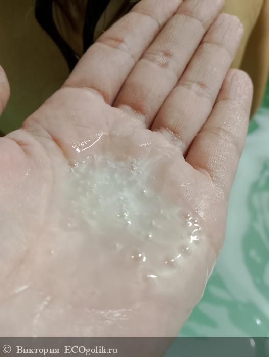 Текстура шампунь-геля не очень густая, и не жидкая (что-то среднее) Можно так сказать прозрачная, но с белым оттенком с перламутром, красиво блестит.