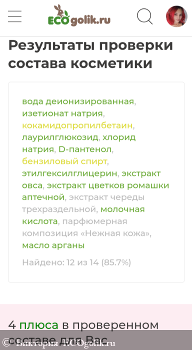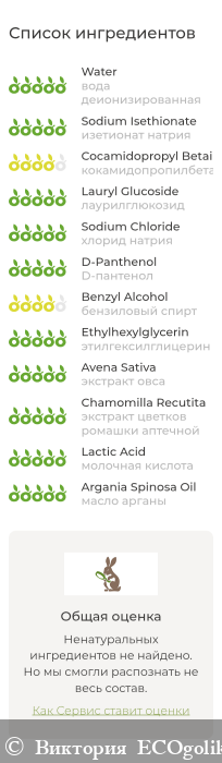 Вода деионизированная, изетионат натрия, кокамидопропилбетаин, лаурилглюкозид, хлорид натрия, D-пантенол, бензиловый спирт, этилгексилглицерин, экстракт овса, экстракт цветков ромашки аптечной, экстракт череды трехраздельной, молочная кислота, парфюмерная композиция «Нежная кожа», масло арганы.