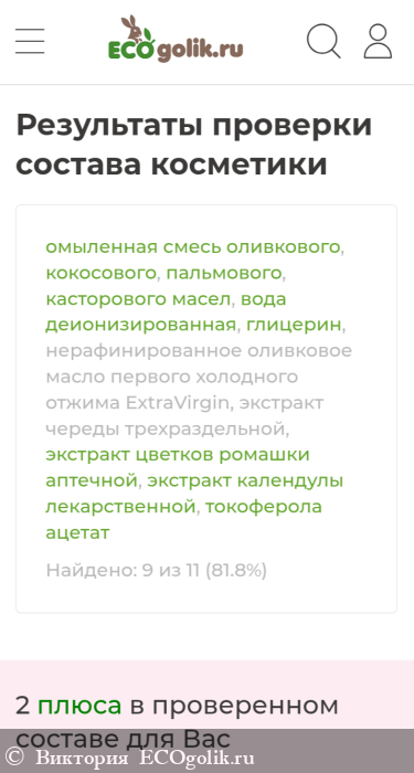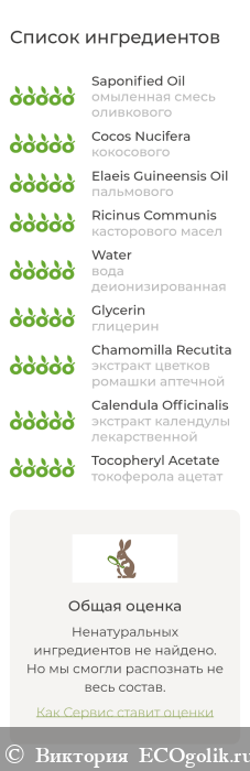 омыленная смесь оливкового, кокосового, пальмового и касторового масел, вода деионизированная, глицерин, нерафинированное оливковое масло первого холодного отжима ExtraVirgin, экстракт череды трехраздельной, экстракт цветков ромашки аптечной, экстракт календулы лекарственной, токоферола ацетат (витамин Е).